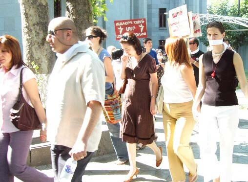 Demonstrators against the bill outside parliament on July 2 (RFE/RL) July 3, 2007 (RFE/RL) -- The Armenian parliament has failed to pass a bill that would have placed severe restrictions on foreign broadcast media, particularly RFE/RL.