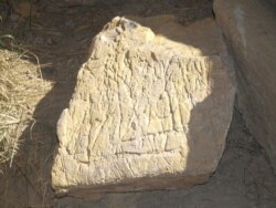 Umetalieva says this is one of the damaged tablets (RFE/RL, click to enlarge)Toktayim Umetalieva, who heads a Kyrgyz coalition of nongovernmental groups, says she visited the excavation site and witnessed firsthand destruction like the jackhammering of an ancient stone tablet. Umetalieva has appealed to President Kurmanbek Bakiev to stop the excavation work. But she appears to have opponents within the administration.