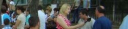 [unintelligible voices of people in line debating issues of rights, democracy.]