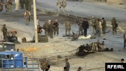 Afghan and coalition troops investigate the scene of today's suicide attack outside Kabul (RFE/RL) August 25, 2007 -- Interior Ministry officials said today that a suicide car bomber attacked a convoy of U.S.-led coalition troops near Kabul.