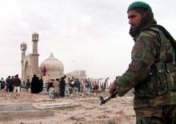 An ANA soldier stands guard as Muslims gather at a shrine in Herat (epa)