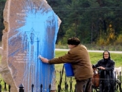 Historian Swartz says that in postcommunist Belarus, the authorities have attempted to commemorate the Holocaust. "Every single town where there were Jews who were killed has an execution site that was put up by the government," Swartz said. "The wording during the Soviet period was that a peaceful Soviet citizen was killed by a fascist. Now, as they put up new ones, it is much more straightforward, and just says that Jews were killed by Germans and their collaborators."
