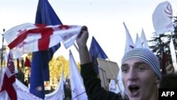 Georgian demonstrators in Tbilisi on November 4 (AFP) November 4, 2007 (RFE/RL) -- Thousands of protesters rallied for a third straight day in the Georgian capital of Tbilisi today to press their demands for the resignation of President Mikheil Saakashvili.