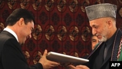 "We had a discussion with the Turkmen president on a series of issues that involve our two countries," Karzai said. "The main areas of our talks were on the exchange of energy between the two countries, developing transportation, communications, and on the gas pipeline that will export natural gas from Turkmenistan to Afghanistan, Pakistan, and India. We discussed a railway between our two countries -- and how to extend the railroad through Afghanistan to neighboring countries. Also, we spoke about the importation of electricity from Turkmenistan to Afghanistan. And we had a discussion on terrorism threats and regional problems."