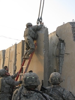 The wall consists of 3.7-meter-high concrete slabs, each weighing over 5 tons. Soldiers from the 64th Brigade Support Battalion, a National Guard unit that normally transports water, fuel, and other supplies to soldiers, ferry the barriers using forklift loaders from a nearby staging area and lower them into place with a crane. Soldiers from 1/68 provide security and also help guide the slabs into place. The first slab was placed on April 19, and despite daily ambushes by gunmen, more than 1,000 now stand, meaning the wall is nearly half-completed.