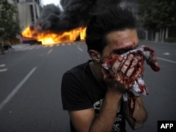 An injured supporter of defeated Iranian presidential candidate Mir Hossein Musavi covers his face during riots in Tehran.