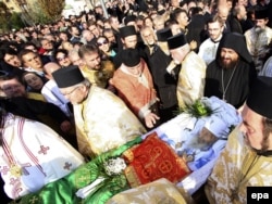 The body of Serbian Orthodox Patriarch Pavle is carried in a procession during his funeral in Belgrade in November.