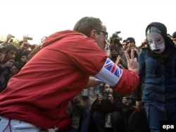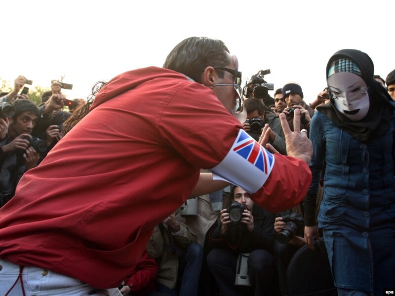 Iranian conservatives staged street theater at a protest in front of the British Embassy in Tehran on December.