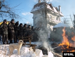 MOSCOW -- Nearly a week after bulldozers, police, and demolition crews moved in to destroy several luxury homes in the western Moscow neighborhood of Rechnik, they returned in force on January 26 to tear down two more.