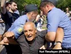 Police detain Konstantin Kosyakin after he and others tried to deliver their protest statement to the government in Moscow.