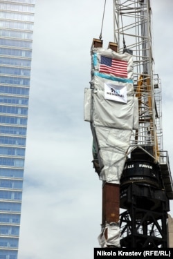One of the two 21-meter-long, 50-ton steel beams from the original Twin Towers is positioned at the site of the future WTC museum and memorial.
