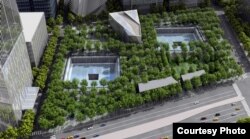 An aerial view of the 9/11 memorial with the two reflecting pools and waterfalls at the footprints of the original Twin Towers. The complex is scheduled to be finished by 2018.