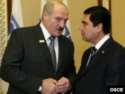 "OK, here's the plan." The president of Belarus, Alyaksandr Lukashenka (left) and Turkmen President Gurbanguly Berdymukhammedov confer at an OSCE summit in Astana in December.
