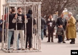 Otpor members stand in a cage made of newspapers to protest against the suppression of independent media in Serbia in March 2000.