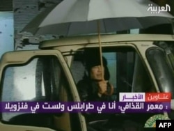 Qaddafi had appeared briefly on state television on the night of February 21 amid rumors he had fled to Venezuela. He was shown in a strange pose, sitting in a military vehicle with the door open and holding an umbrella over his head.