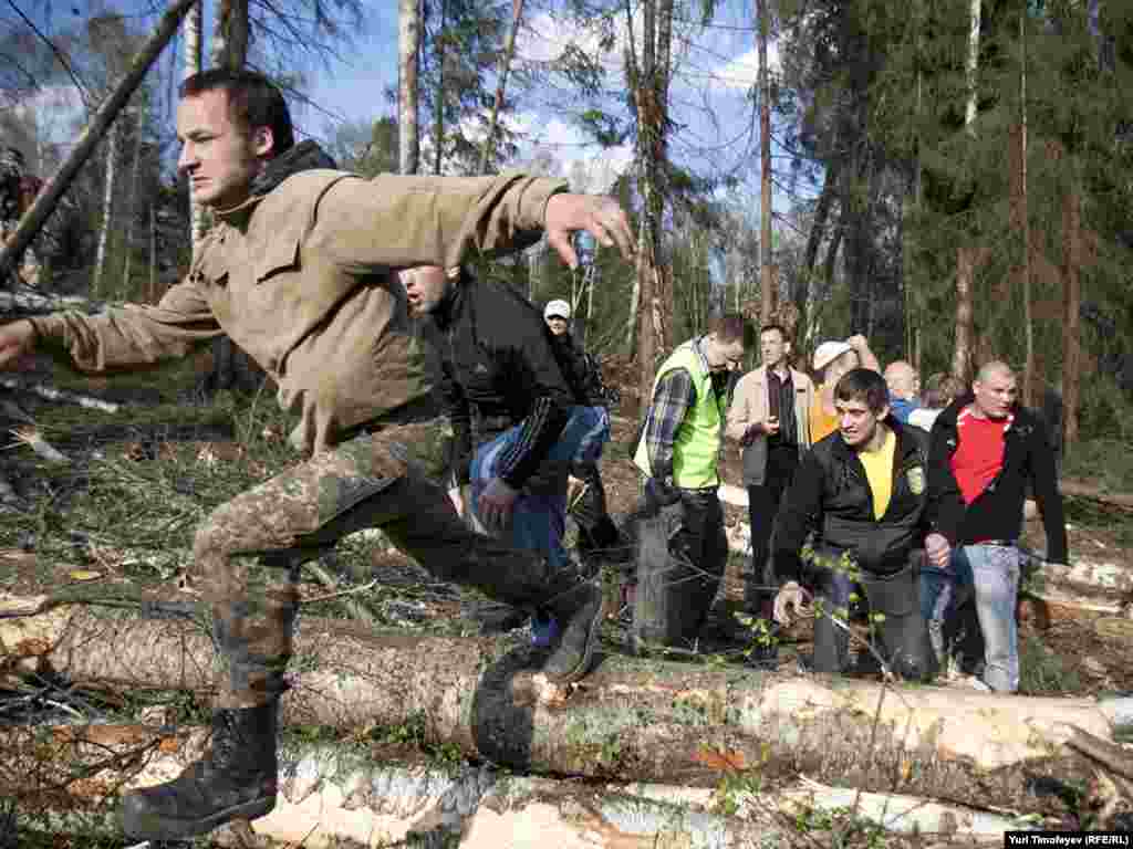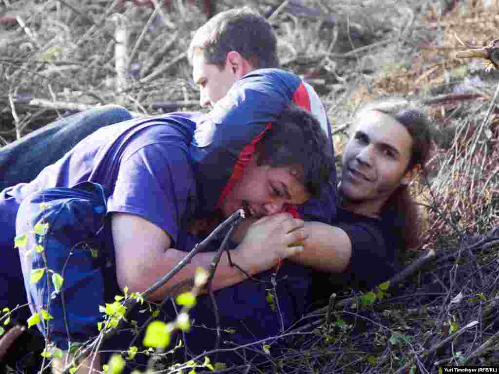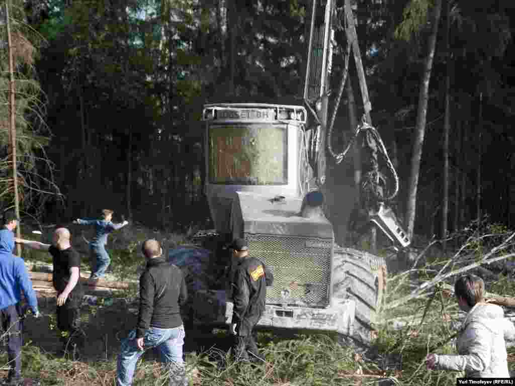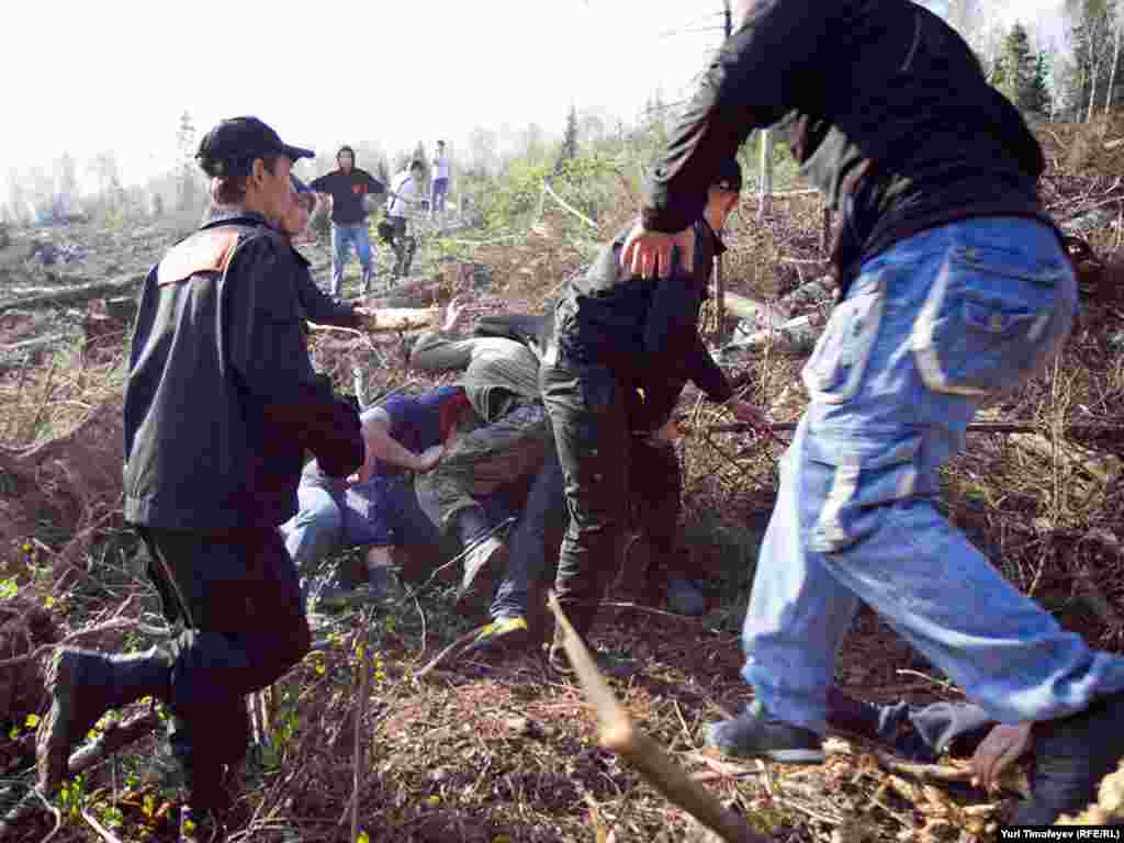 Ecological activists trying to stop the felling of trees in the Khimki Forest clash on May 5 with security agents hired by the highway companies.