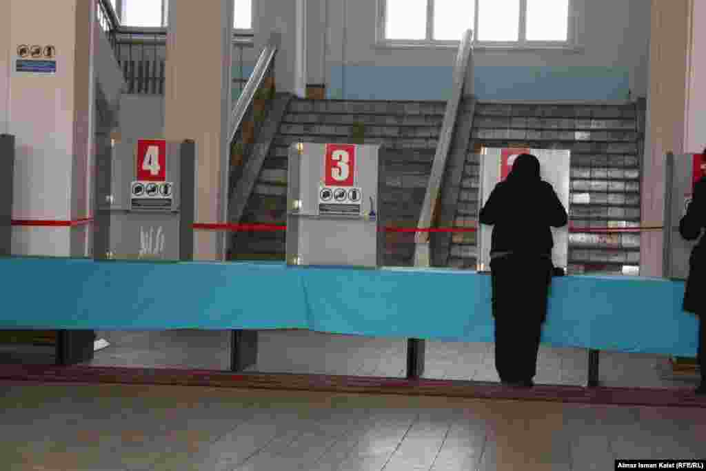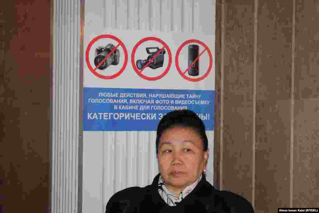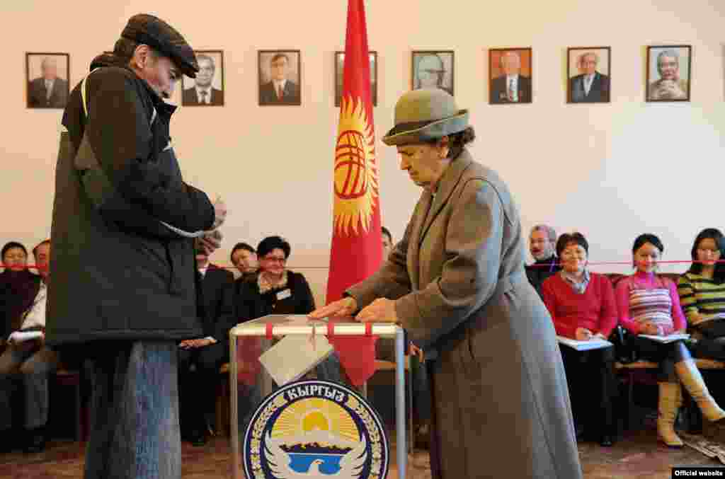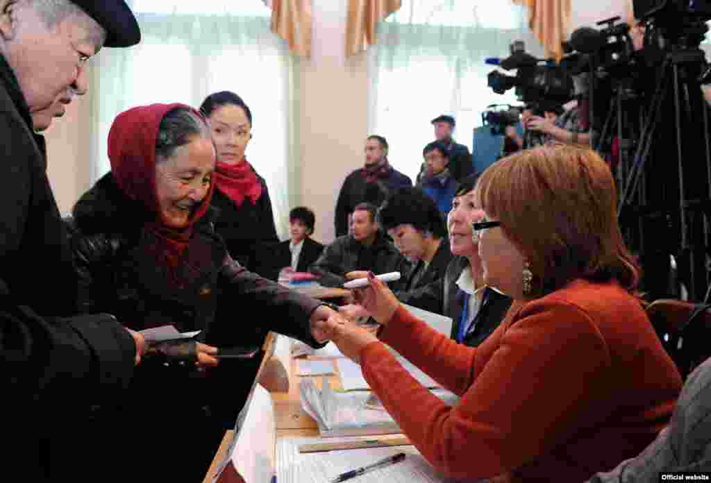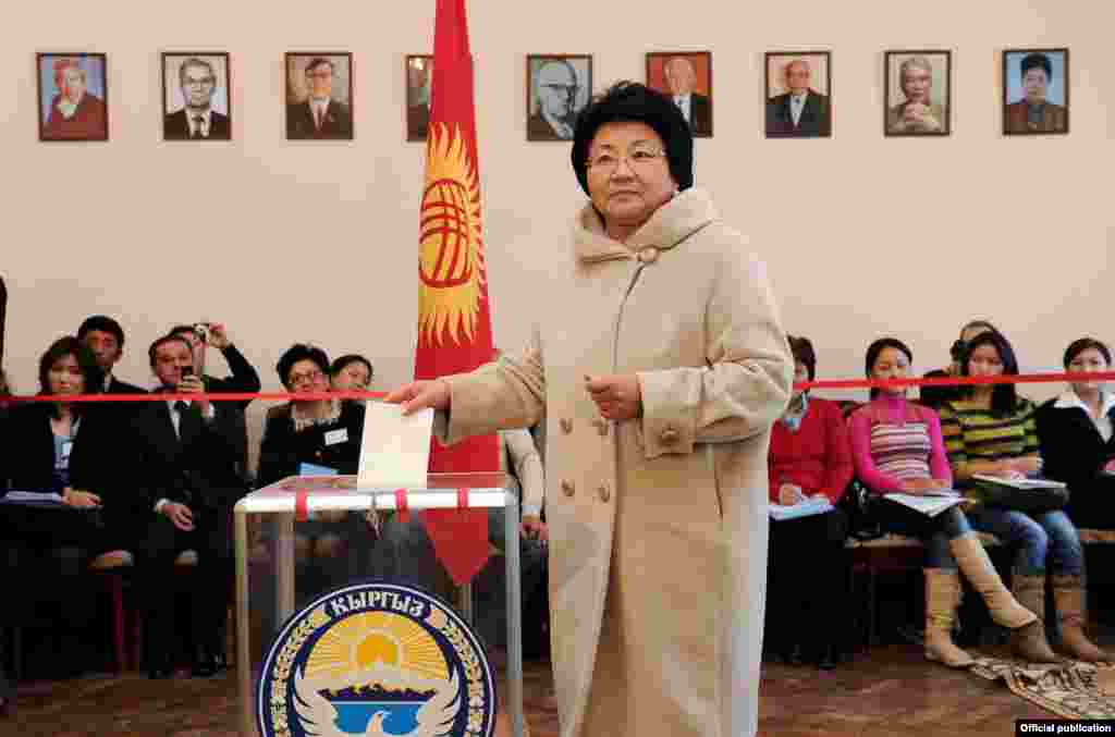 Outgoing leader Roza Otunbaeva arrives to vote at a Bishkek polling station.