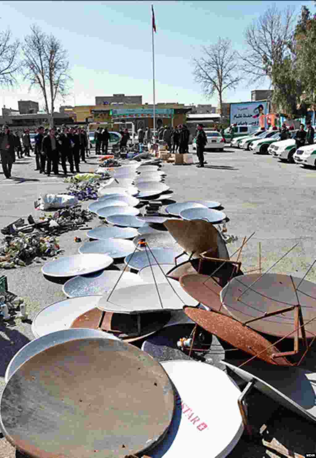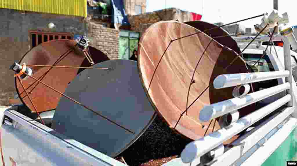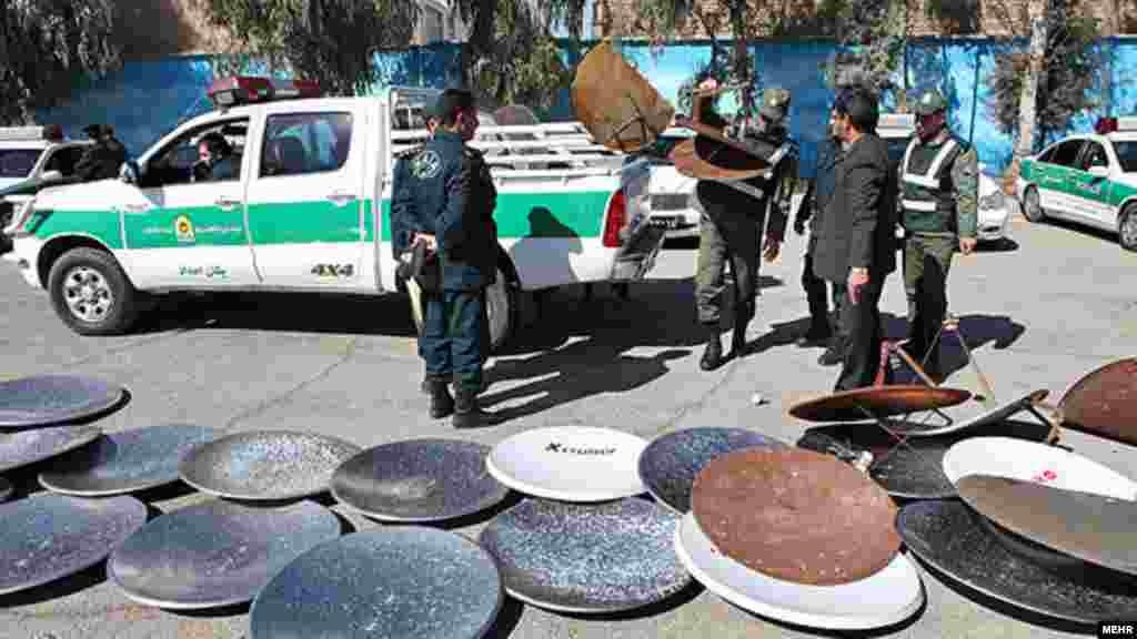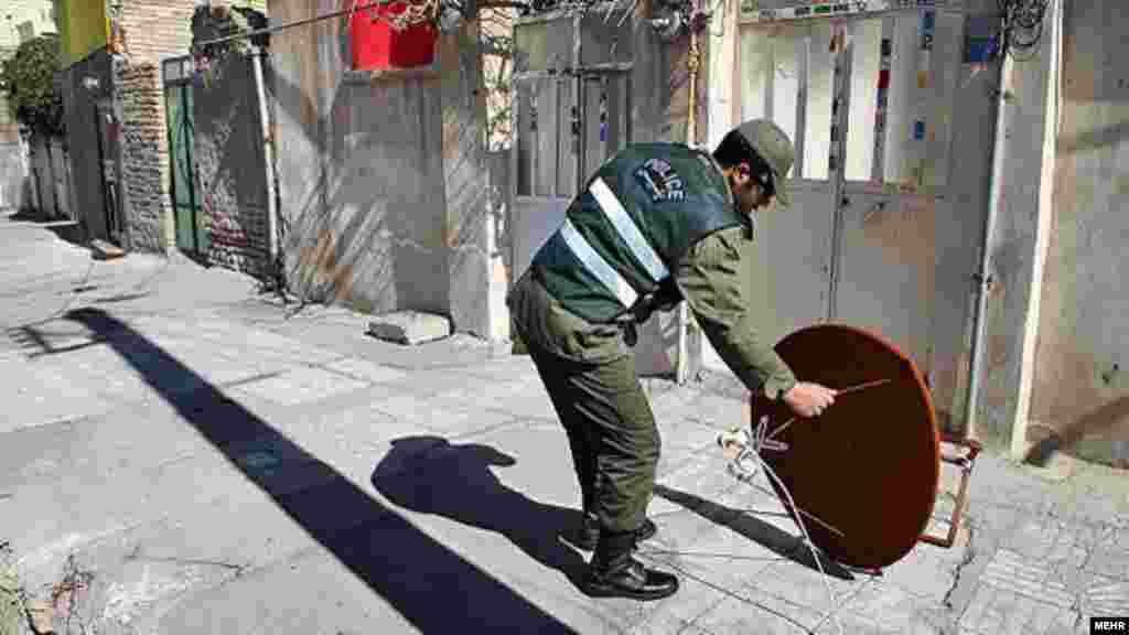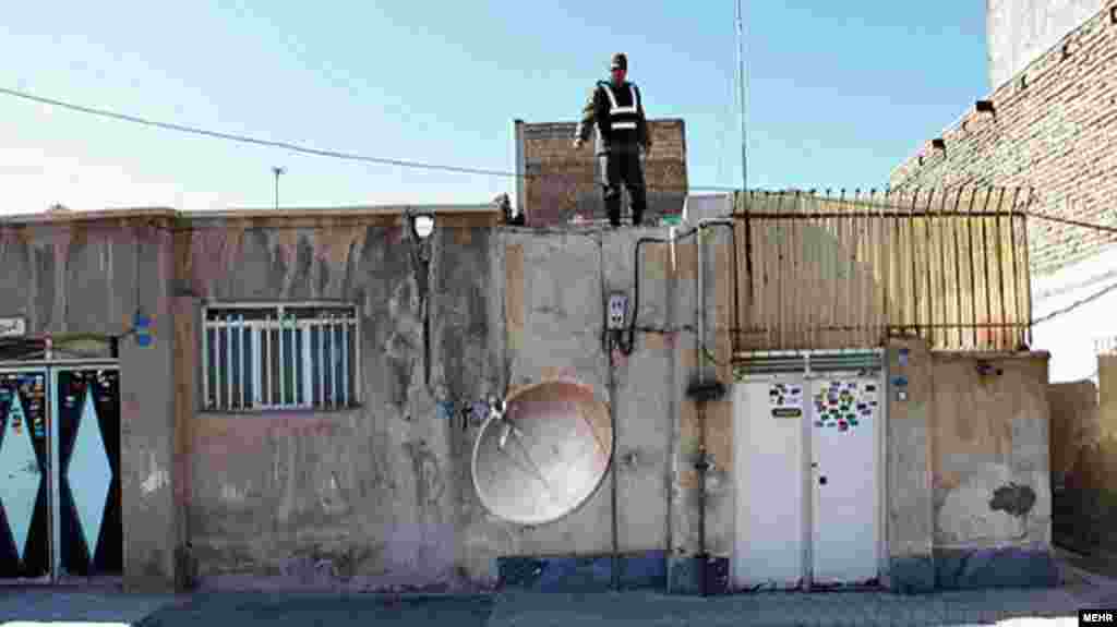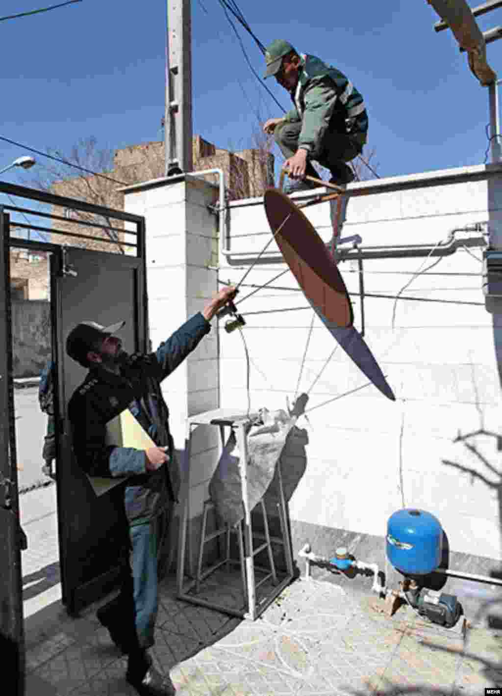 These photographs show Iranian police removing and collecting illegal satellite dishes from the roofs of houses and apartments in eastern Tehran in late February. The war against the dishes, which allow Iranians to see uncensored foreign news and entertainment programs, appears to be a losing one, however. Police officers spend a considerable amount of time searching for them, dismantling them, and confiscating them. But like dandelions, the dishes seem to sprout right back up again.