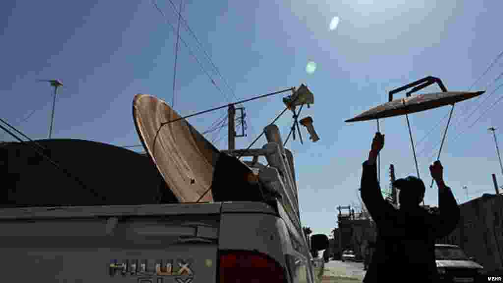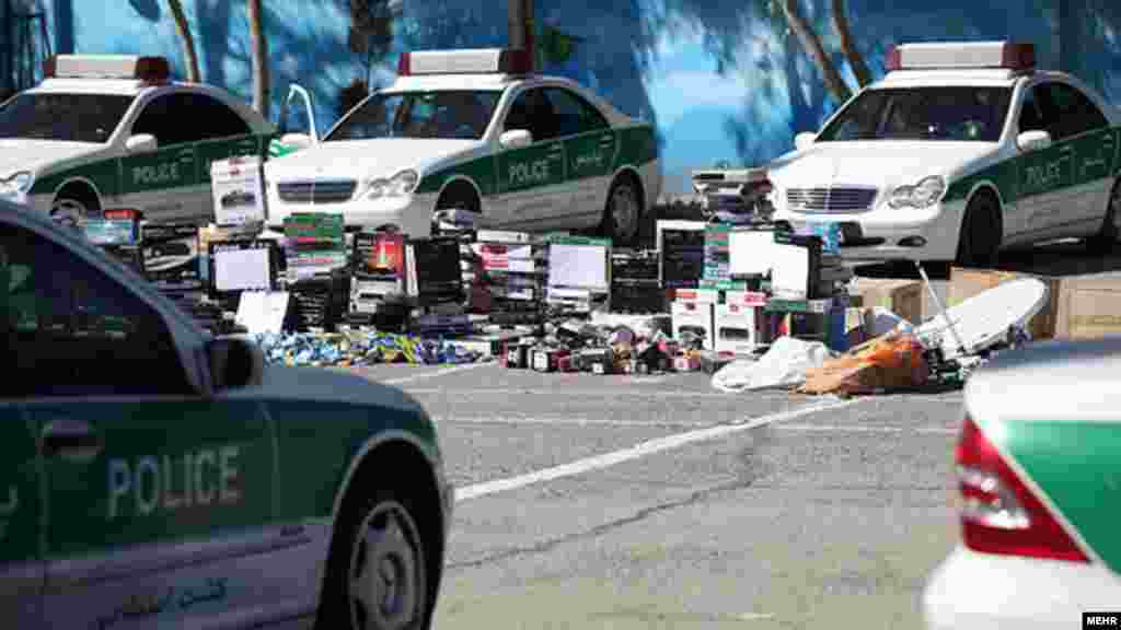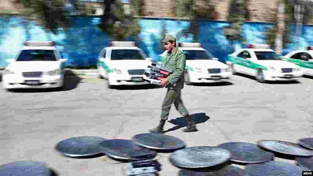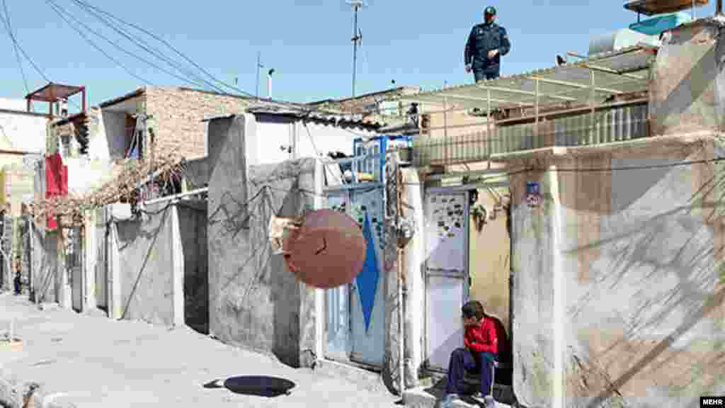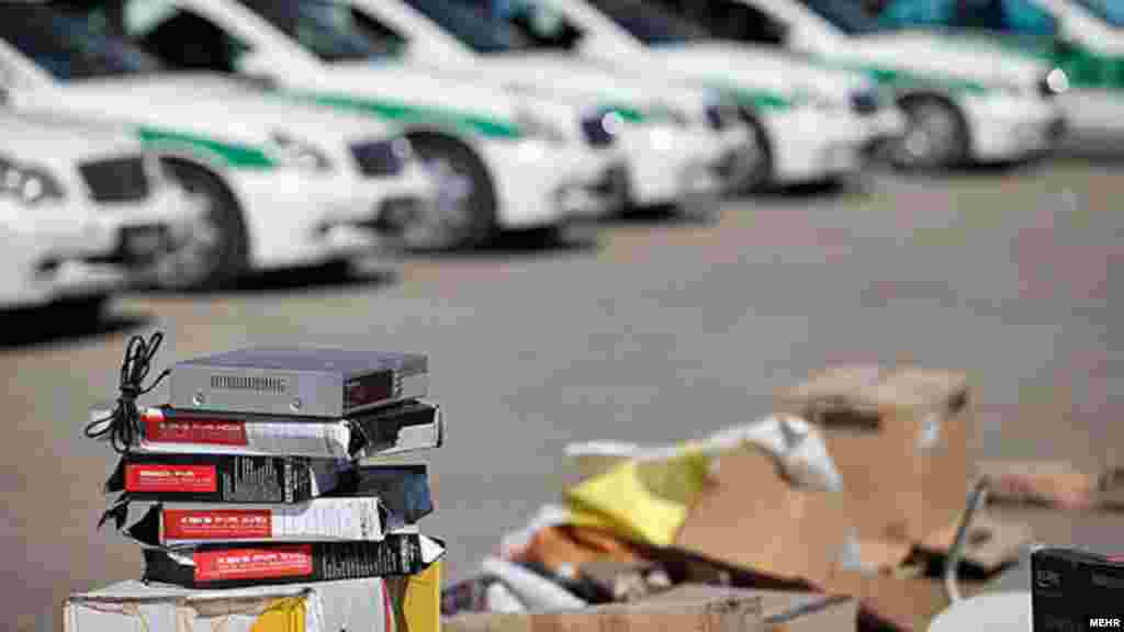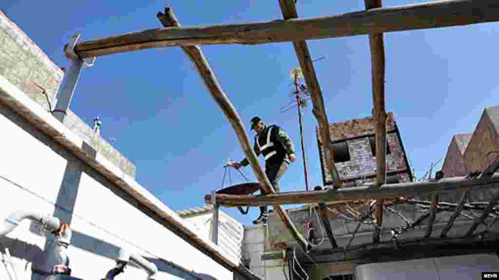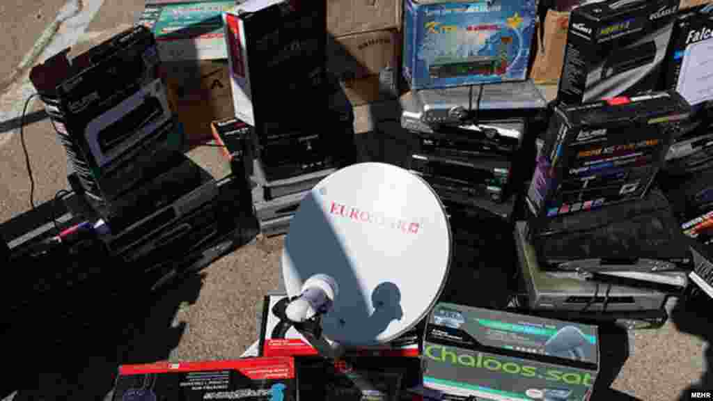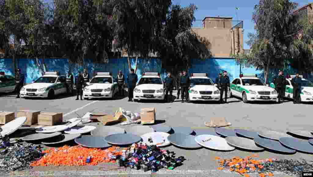These photographs show Iranian police removing and collecting illegal satellite dishes from the roofs of houses and apartments in eastern Tehran in late February. The war against the dishes, which allow Iranians to see uncensored foreign news and entertainment programs, appears to be a losing one, however. Police officers spend a considerable amount of time searching for them, dismantling them, and confiscating them. But like dandelions, the dishes seem to sprout right back up again.