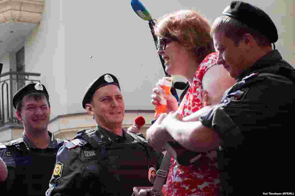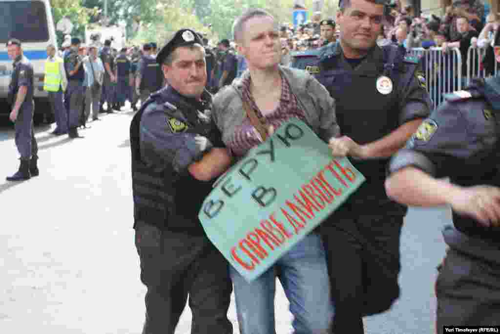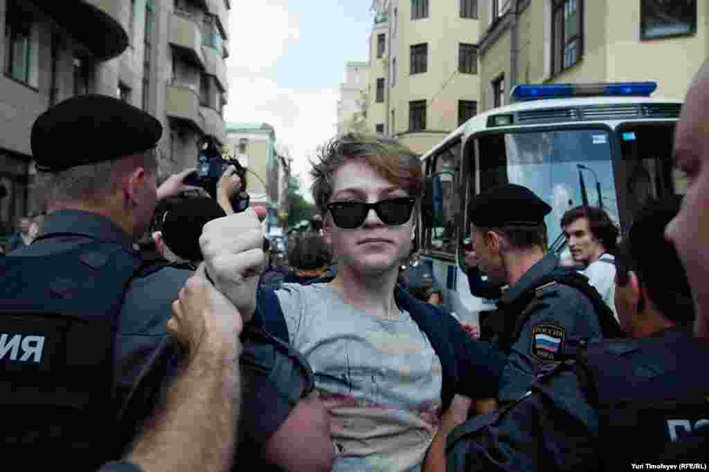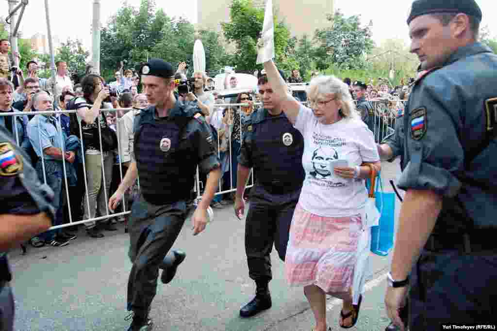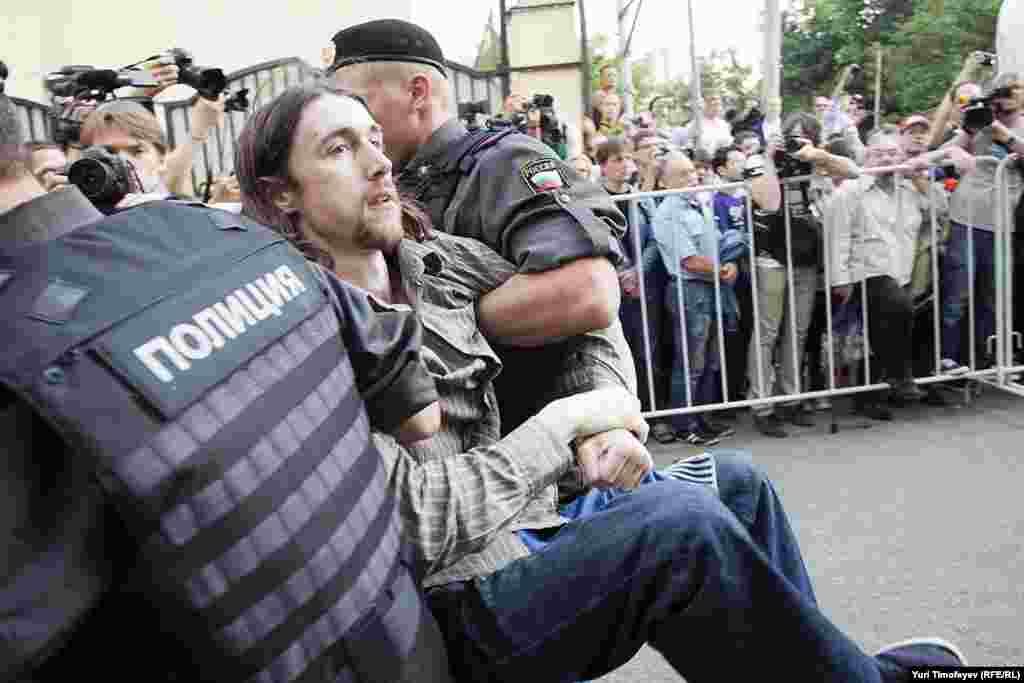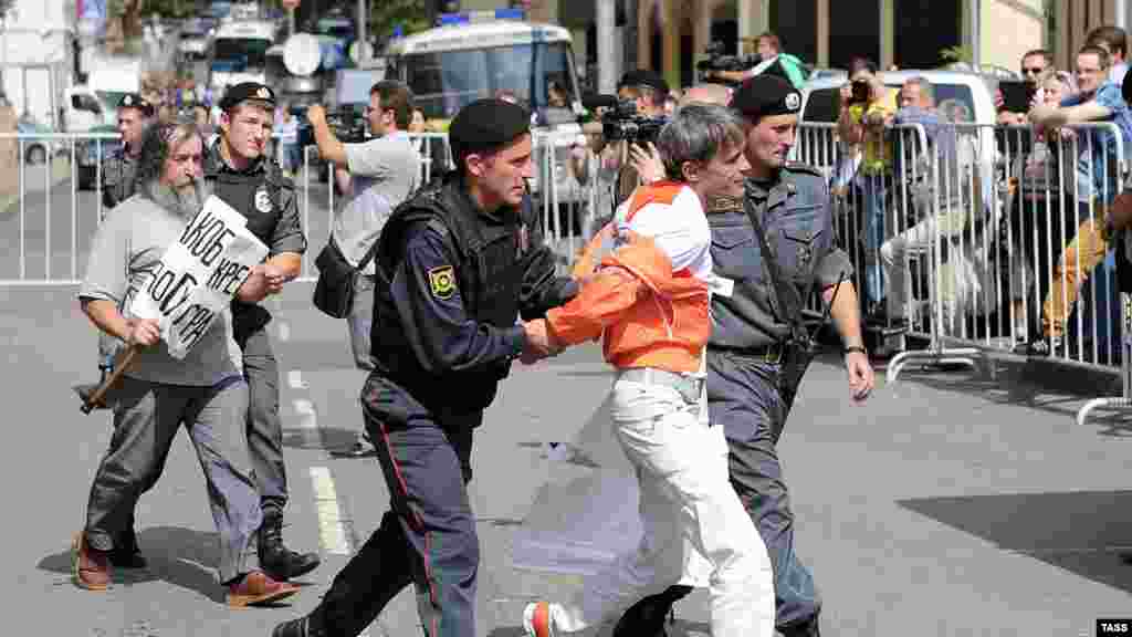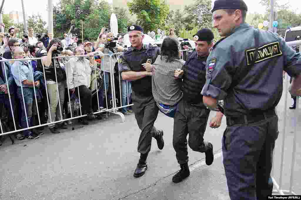Police detain opposition figure Garry Kasparov near the Khamovnichesky court in Moscow.