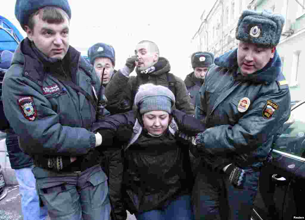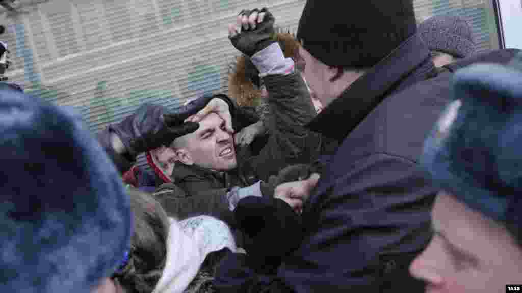 At least 20 people demonstrating in support of rights for homosexuals have been detained outside the State Duma as deputies were set to debate a new law against disseminating "homosexual propaganda" to minors. Scuffles broke out between gay rights supporters, who were holding a so-called kiss-in protest, and opponents outside the Duma.