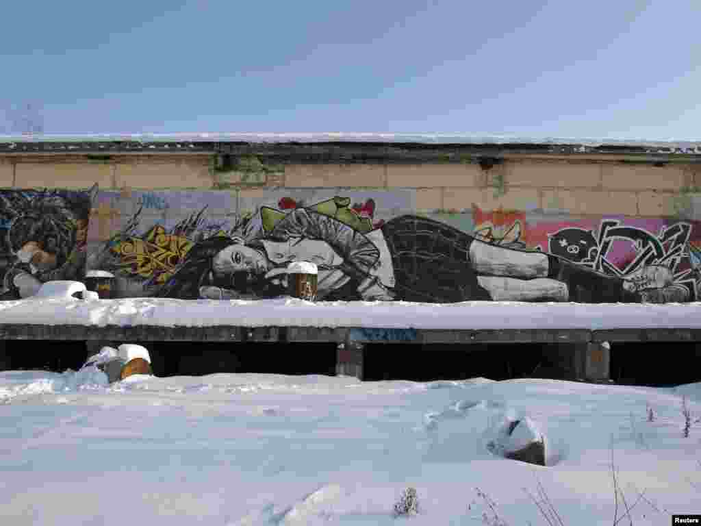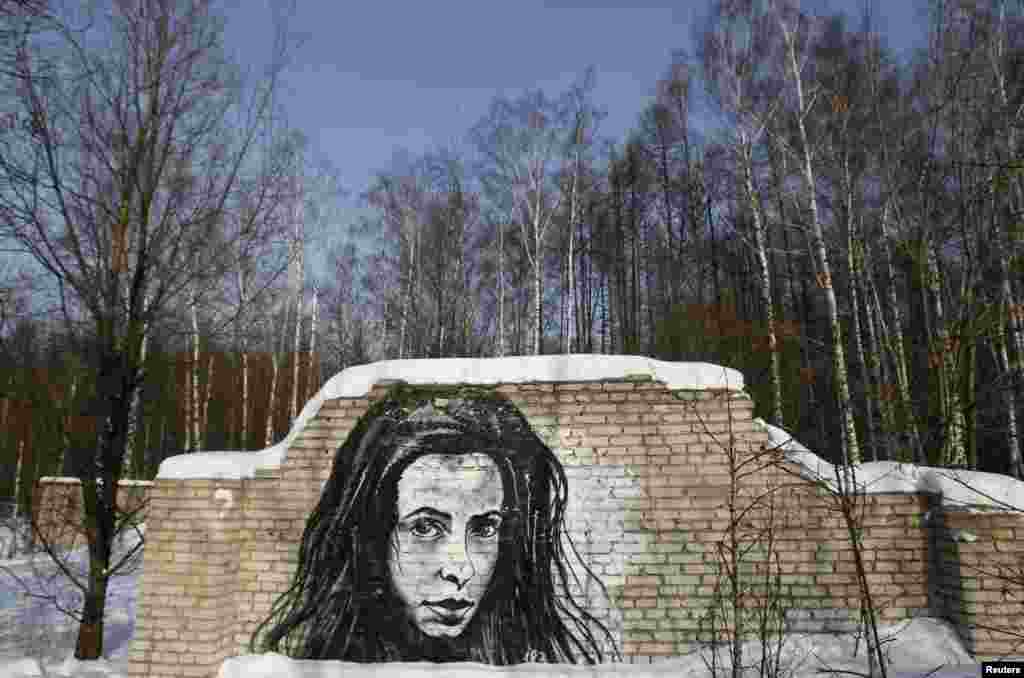 Street artist P183 paints a mural ahead of last year's Russian presidential election on a wall in central Moscow.