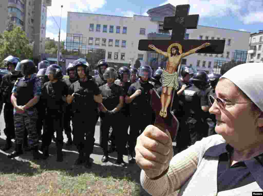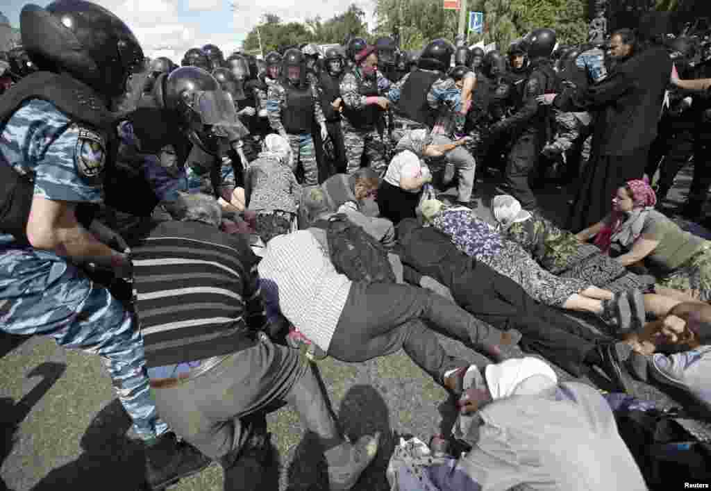 Ukrainian riot police detain an elderly Orthodox Christian activist as she protests against the gay-pride parade.