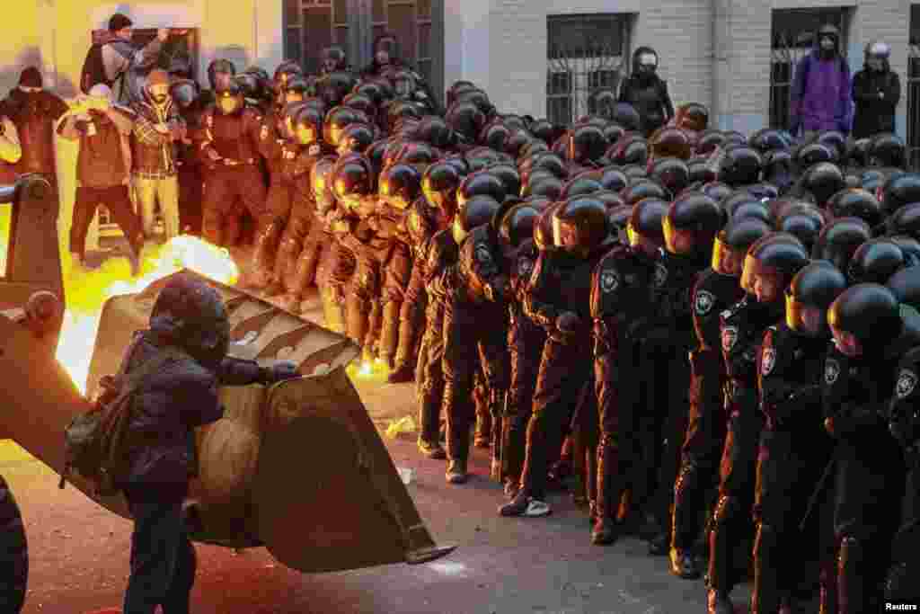 A priest from the St. Elena Lutheran Church attempts to hold protesters back in front of a Kyiv police line.