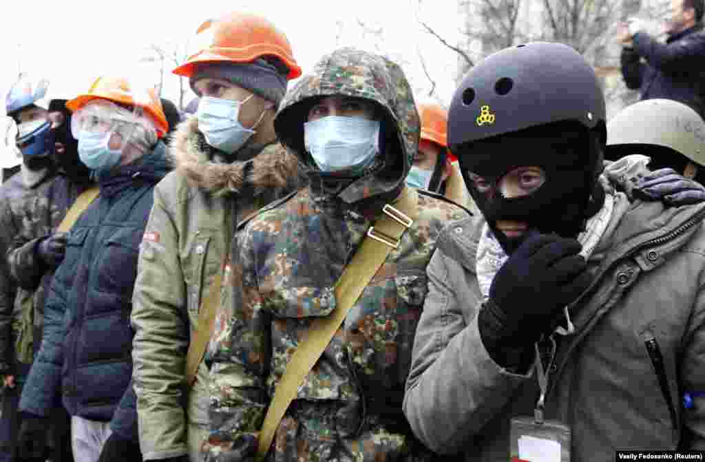 Wounded Reuters photographer Gleb Garanich, who was injured by riot police, takes pictures during a protest on Independence Square.