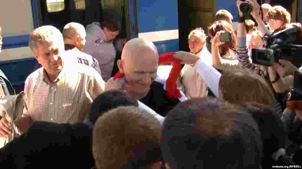Belarusian human rights activist Ales Byalyatski arrived in Minsk after he was released from prison on June 21. He was welcomed at the capital's train station by his wife Natalya Pinchuk and a group of supporters.
