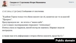 In a post on VKontakte, Russia's largest social media site, which has since been taken down, separatist leader Igor Girkin, aka Strelkov, wrote: "In the vicinity of Torez, we just downed a plane, an AN-26. It is lying somewhere in the Progress Mine. We have issued warnings not to fly in our airspace. We have video confirming. The bird fell on a waste heap. Residential areas were not hit. Civilians were not injured."