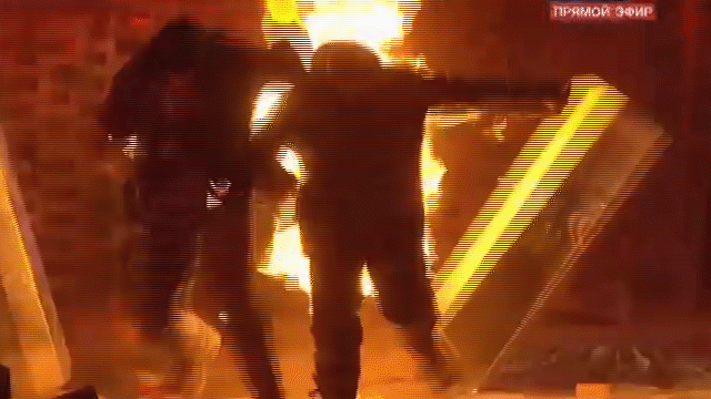 The men in black -- representative, apparently, of pro-Ukraine activists -- cause a map of Ukraine to bleed in the east and then set riot police on fire.