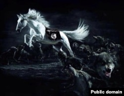 In this image, Islamic State is symbolized by a white steed, which is leaping unscathed from the gaping, slavering jaws of what appear to be a pack of wolves. The wolves presumably represent Islamic State's detractors and enemies, such as the United States and its Western allies.