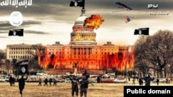 The image of the Capitol shows three impossibly large IS flags atop its roofs and central dome. A few IS militants are depicted milling around on the lawns, while the Capitol building is aflame.