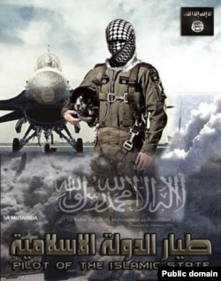 This image depicts a fantasy version of an Islamic State fighter-jet pilot. Standing in front of an aircraft with an Islamic State logo on its nosecone, the pilot's head is entirely wrapped in a black-and-white keffiyah, which appears to be obscuring his vision (not a sensible choice for a fighter pilot).
