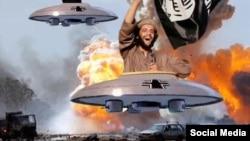 In one image mocking this genre, IS militants -- including “Jihadi John” -- are photoshopped invading a city in spacecraft. One militant laughs as he holds aloft an IS flag:
