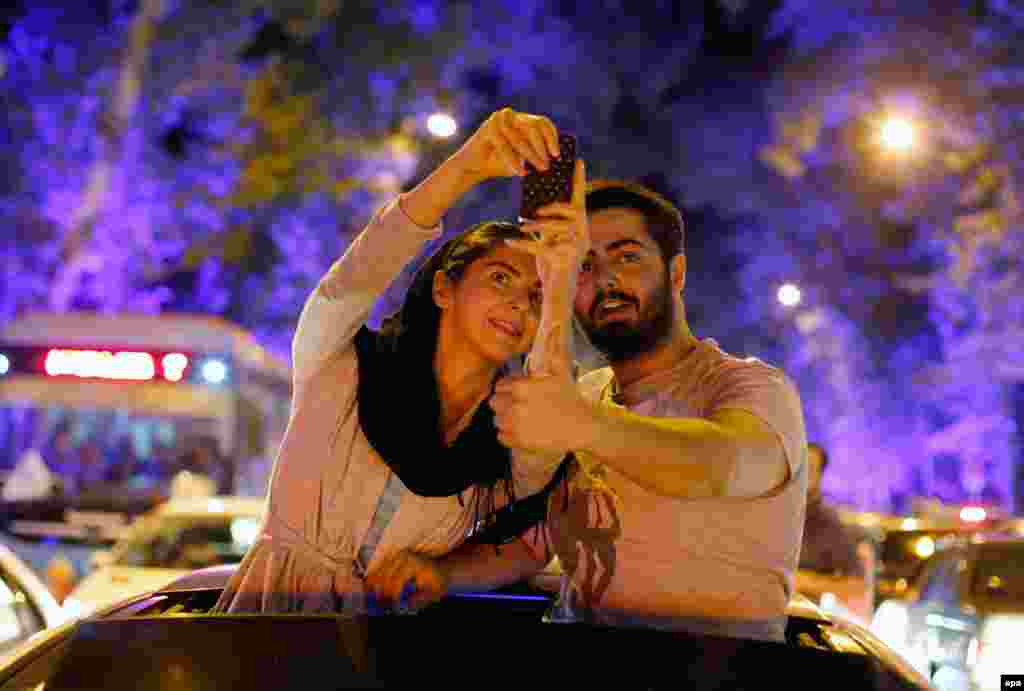 Residents of northern Tehran poured onto the streets after the daily Ramadan fast ended on July 14 to celebrate a long-awaited agreement on the country's nuclear program. Iran's nuclear negotiating team and representatives of world powers had announced the historic nuclear deal in Vienna earlier in the day. (AFP)