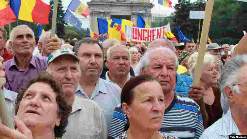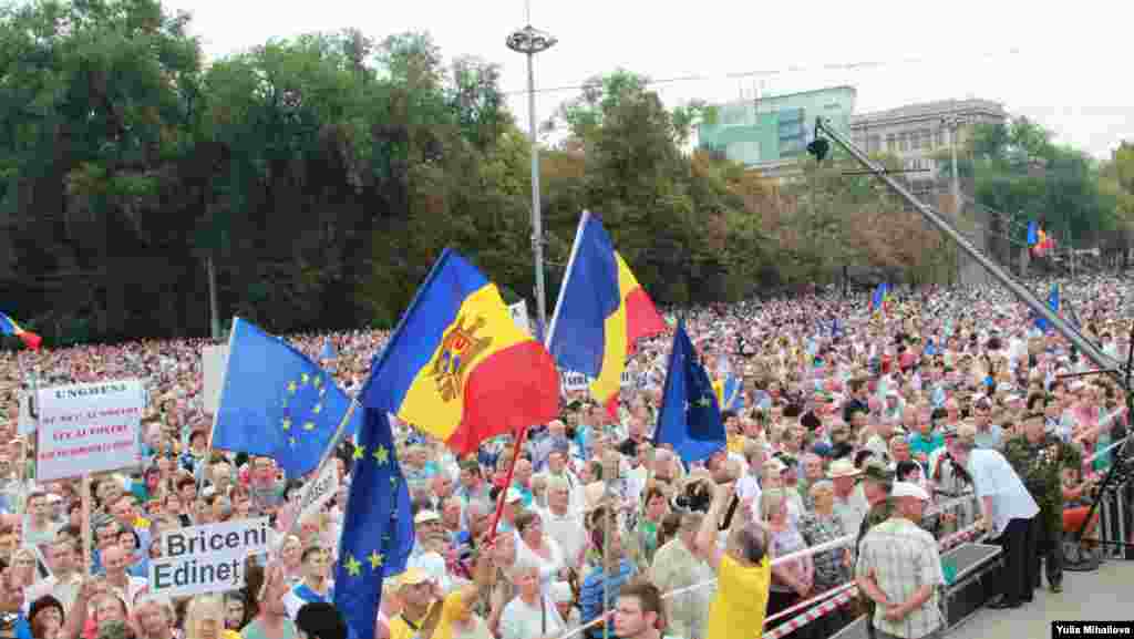 Tens of thousands of people protested in Moldova’s capital on September 6, calling on the president to resign and early elections to take place over a $1 billion bank fraud that has lowered living standards. The protesters arrived in Chisinau from all regions after a new mass organization called DA (Demnitate și Adevăr, or Dignity and Truth) called on people to demonstrate in the central square outside the main government building. Protesters demanded the resignation of President Nicolae Timofti, the election of a new head of state, and the resignation of top officials at Moldova’s central bank and the Attorney General’s Office. Police estimate that there were 60,000 people present, which would make the protest bigger than the mass anticommunist demonstrations of April 2009. Protesters shouted slogans such as “We want our country back!” and “Down with the oligarchs.” Police clashed with supporters of the far left Red Bloc party after they marched to the prosecutor-general’s headquarters and attempted to break through a police cordon. According to Interfax, police detained several protesters, several others were injured, and one woman was hospitalized. Some 30 tents were set up in the evening on the main square of Chisinau and protesters vowed to remain there until their demands are met. Nearly $1 billion -- around one-eighth of the country’s gross domestic product -- disappeared from three banks shortly before the November 2014 parliamentary elections. The bank fraud prompted a rapid depreciation in the national currency, fueling inflation, and lowering living standards. Moldova’s pro-European prime minister, Valeriu Strelets, who took up the post in July, has promised to crack down on corruption.