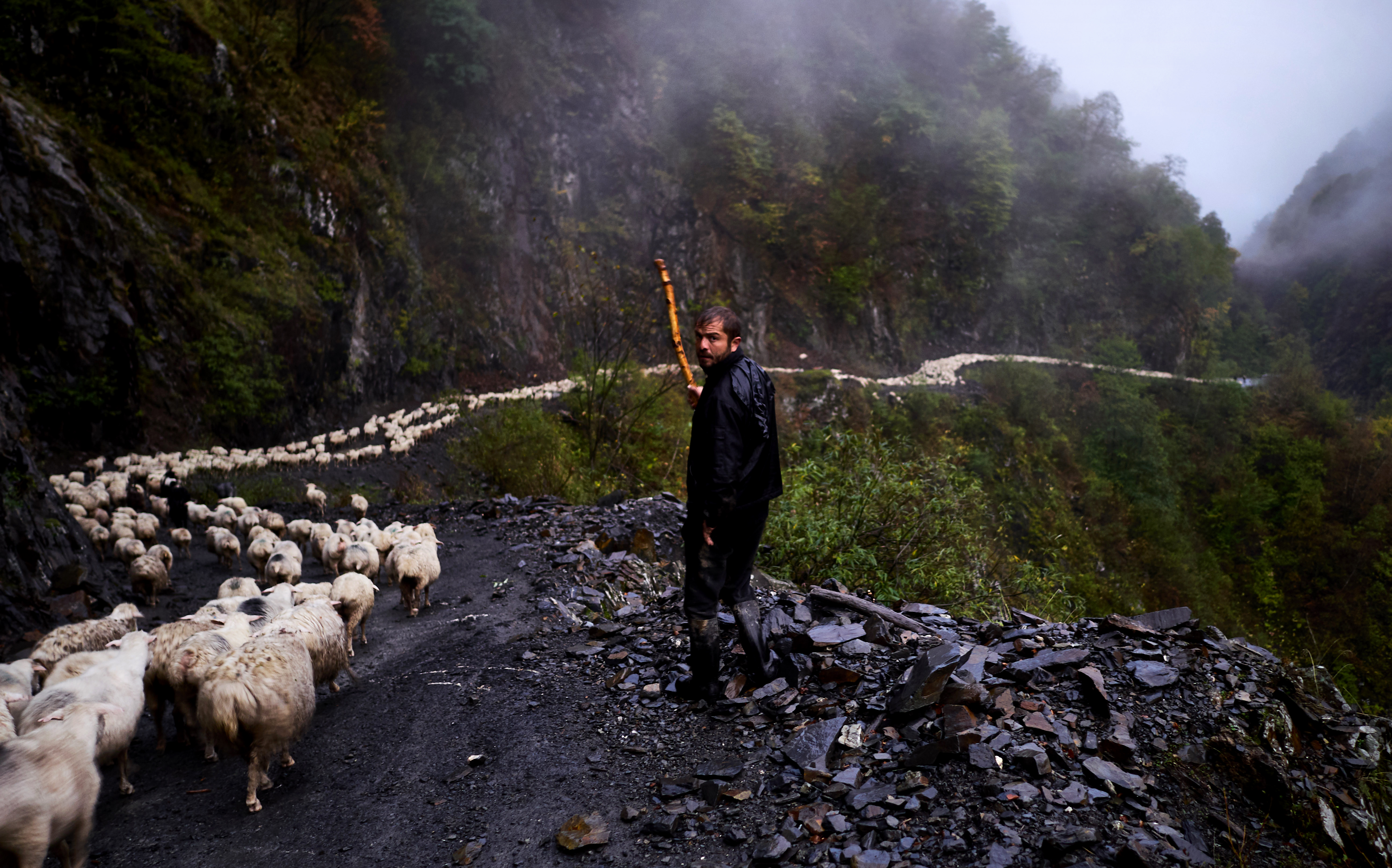 Dato Chkhareuli drives a group of sheep that got disoriented while climbing a serpentine road.