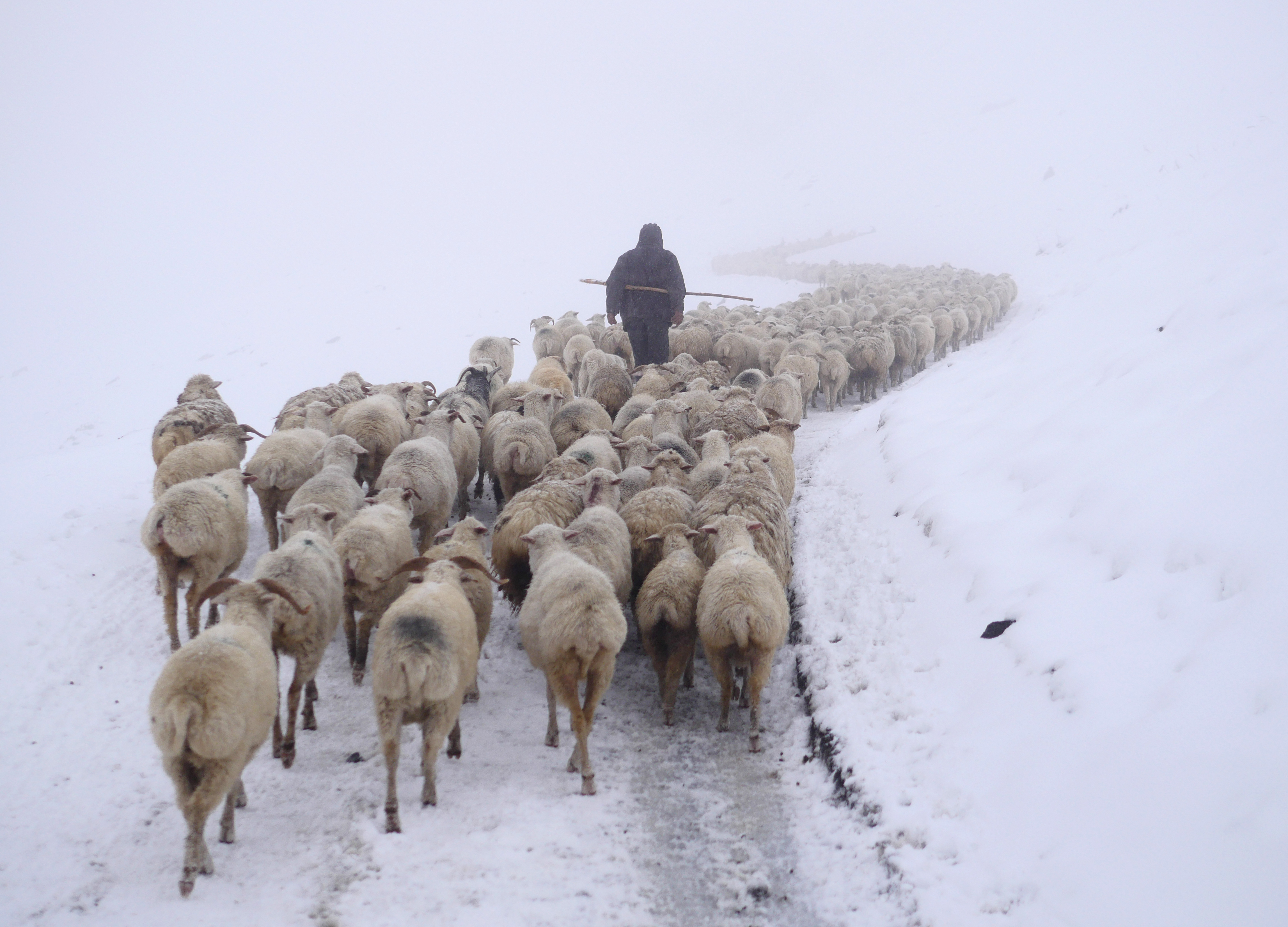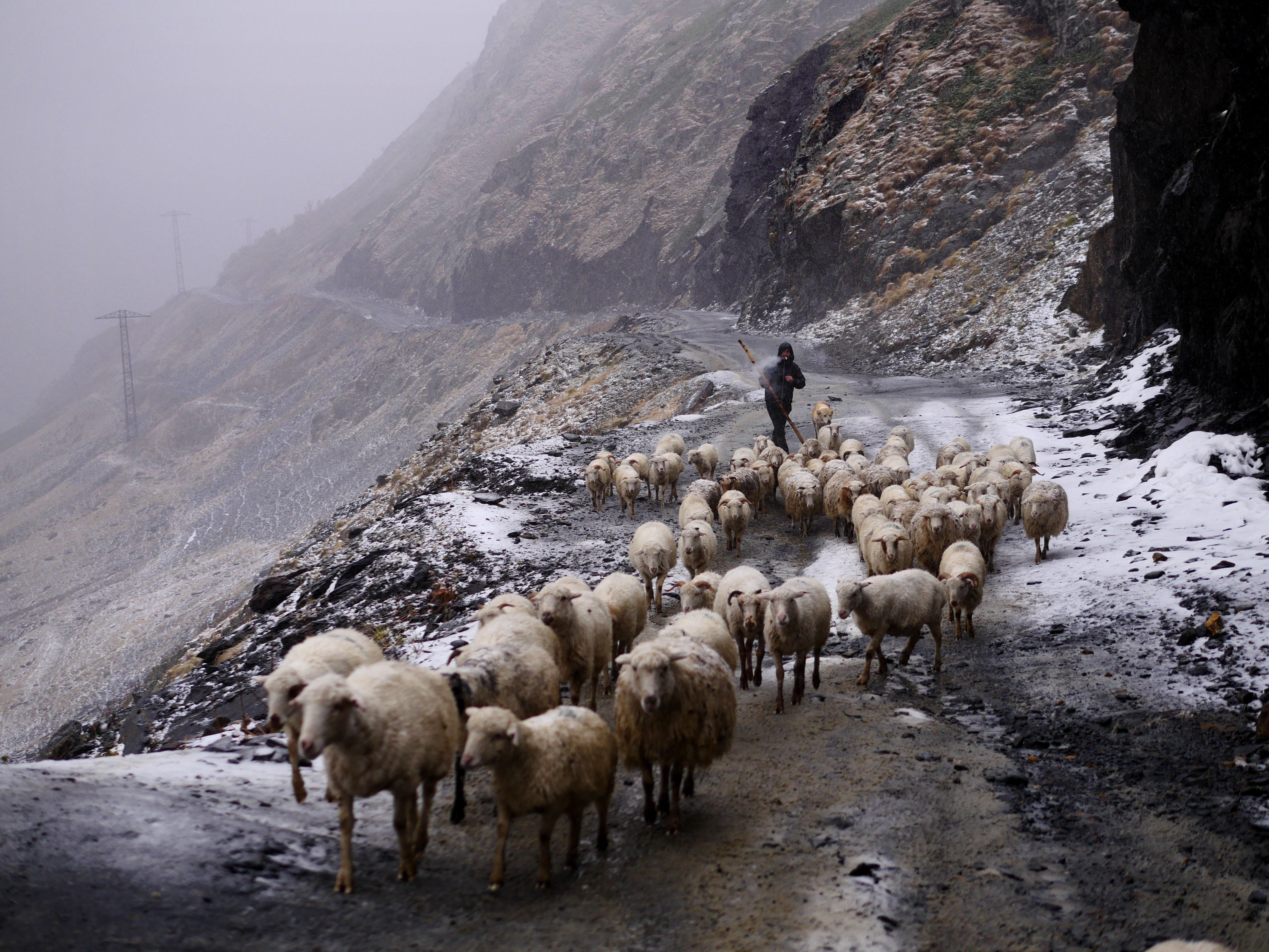 A buffeting wind tugs at the flock as it crests the pass. With no shelter to be had, the sheep push ahead. The animals need to get to the relative warmth of the lower altitudes as quickly as possible.