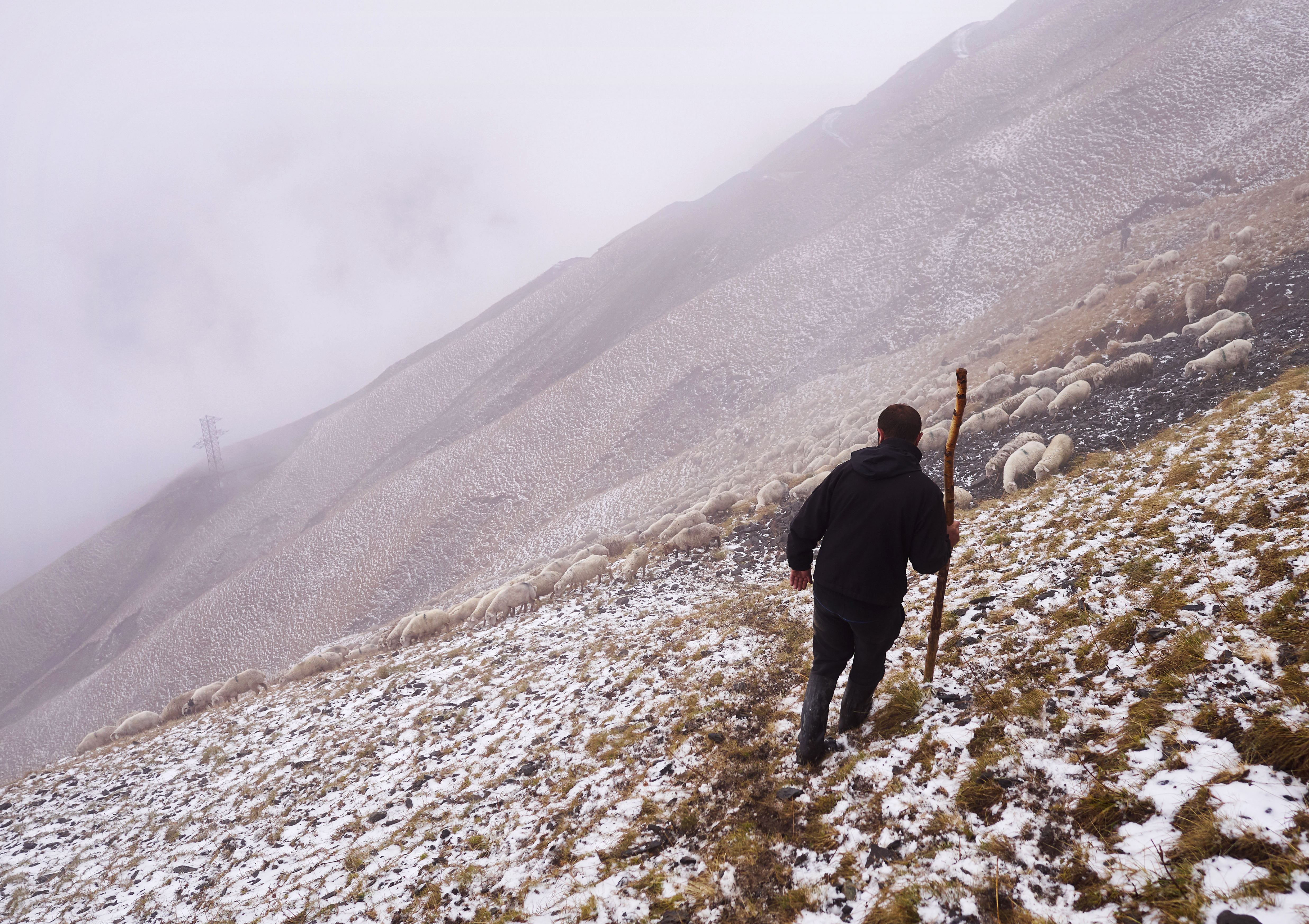 Gigoidze watches for stragglers at the back of the flock. As the sheep climb, the rain turns to sleet, and then snow.