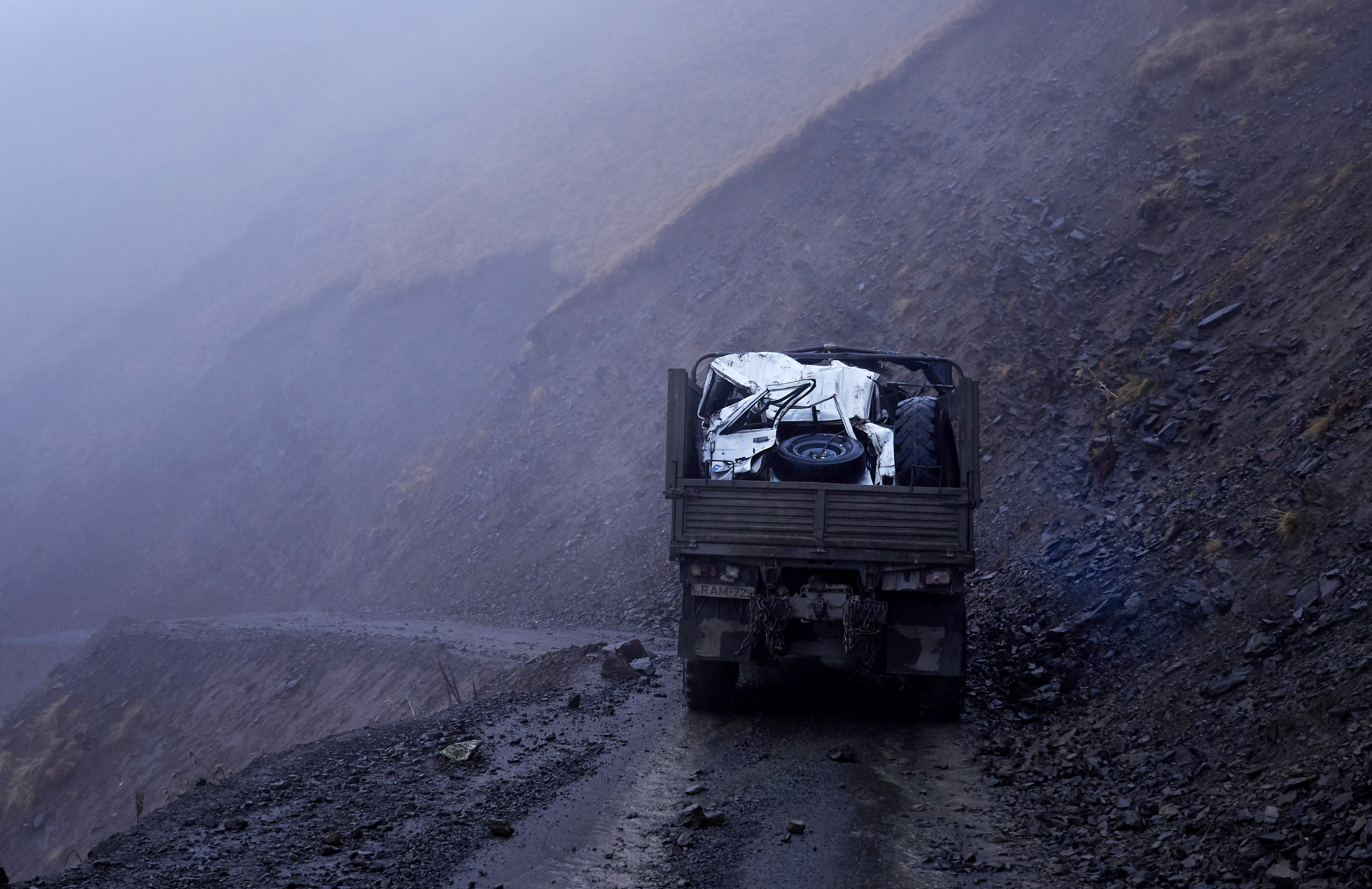 A truck passes carrying the wreckage of a vehicle that toppled off the road. According to group leader Gigoidze, the driver of the vehicle was the dead friend honored with the lunchtime toast.