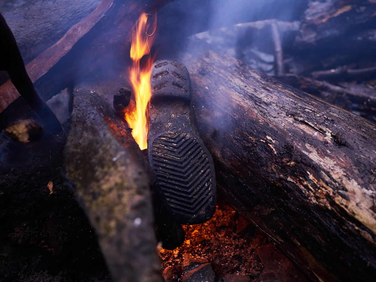 After the shepherds make a kind of rudimentary camp they find the wood is too wet to burn. One of the men stuffs one, then a second, rubber boot into the smoldering logs and the fire is soon roaring.