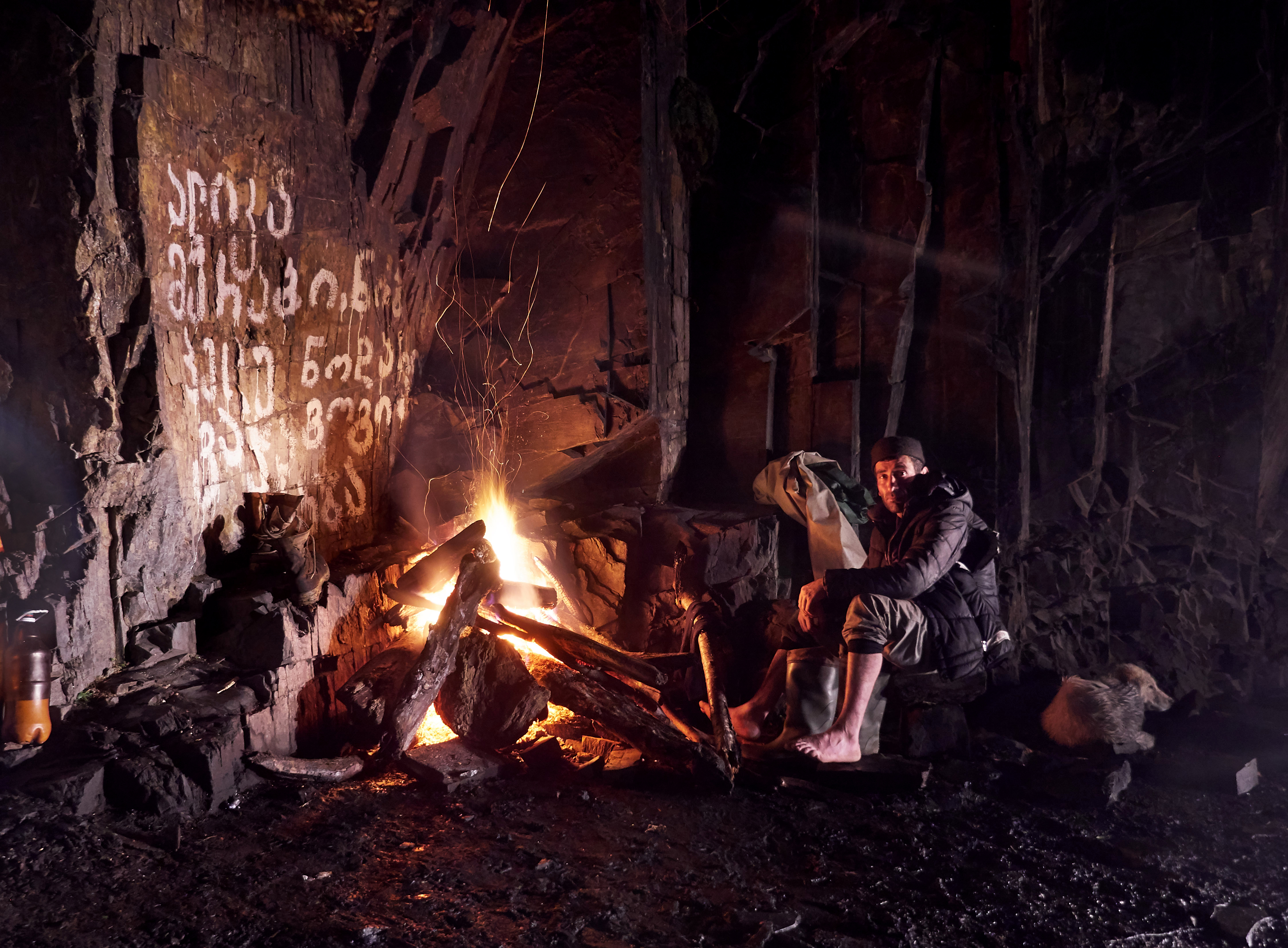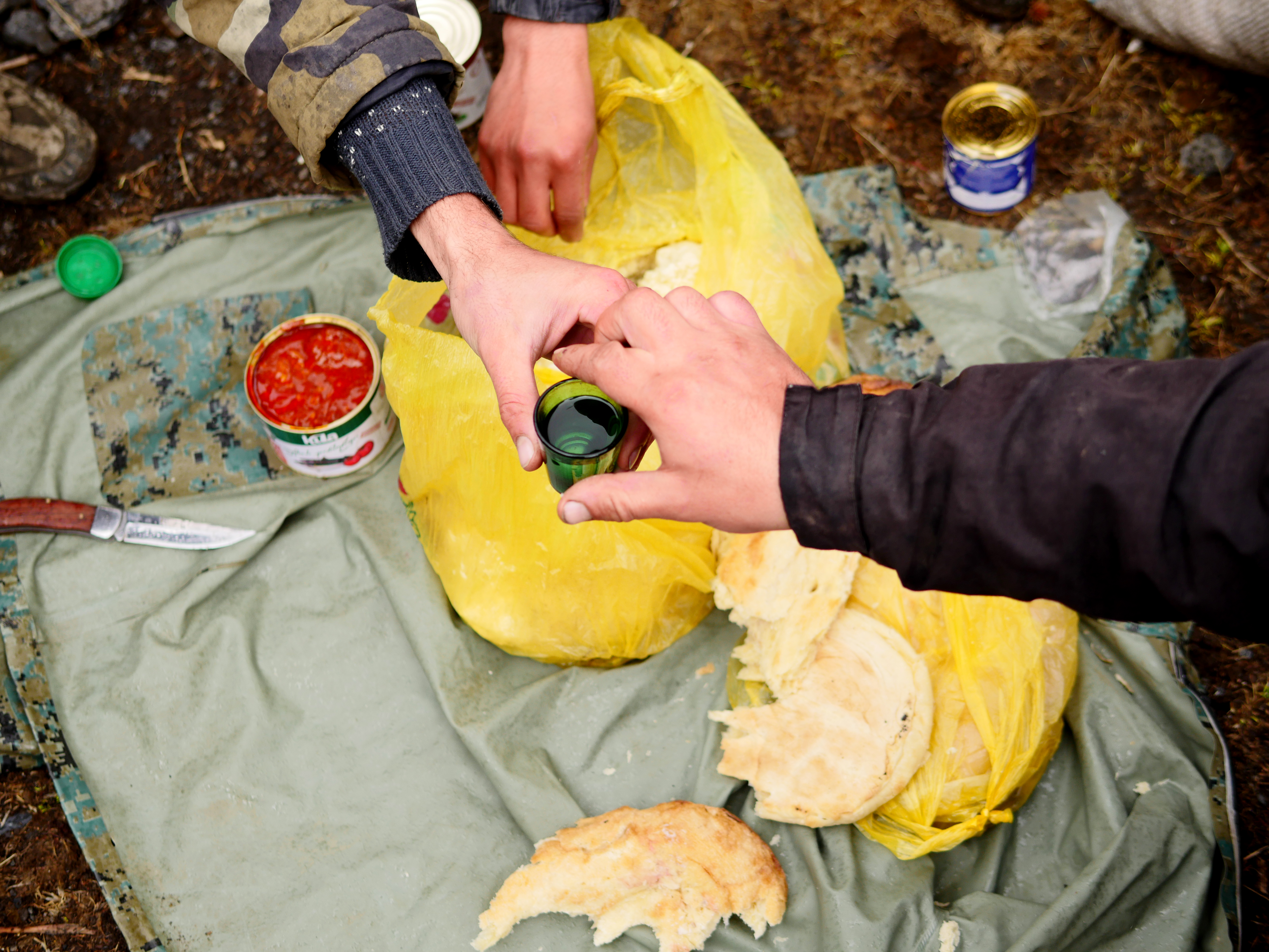 The men get dry as best they can, with countless shots of chacha knocked back in the process, before they finally curl up for the night. Little Georgik slinks inside Chkhareuli's felt sleeping bag.
