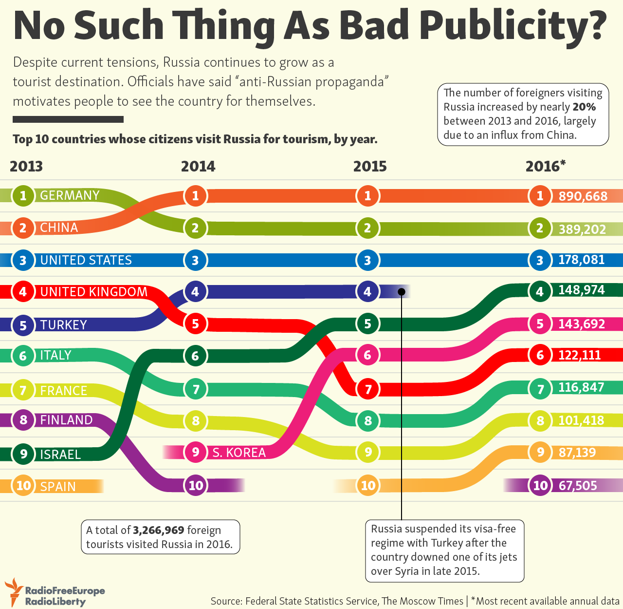Despite current tensions, Russia continues to grow as a tourist destination. Officials have said “anti-Russian propaganda” motivates people to see the country for themselves.