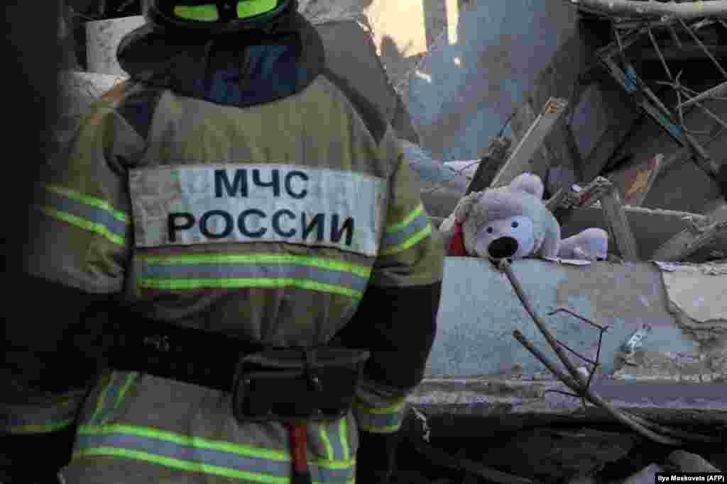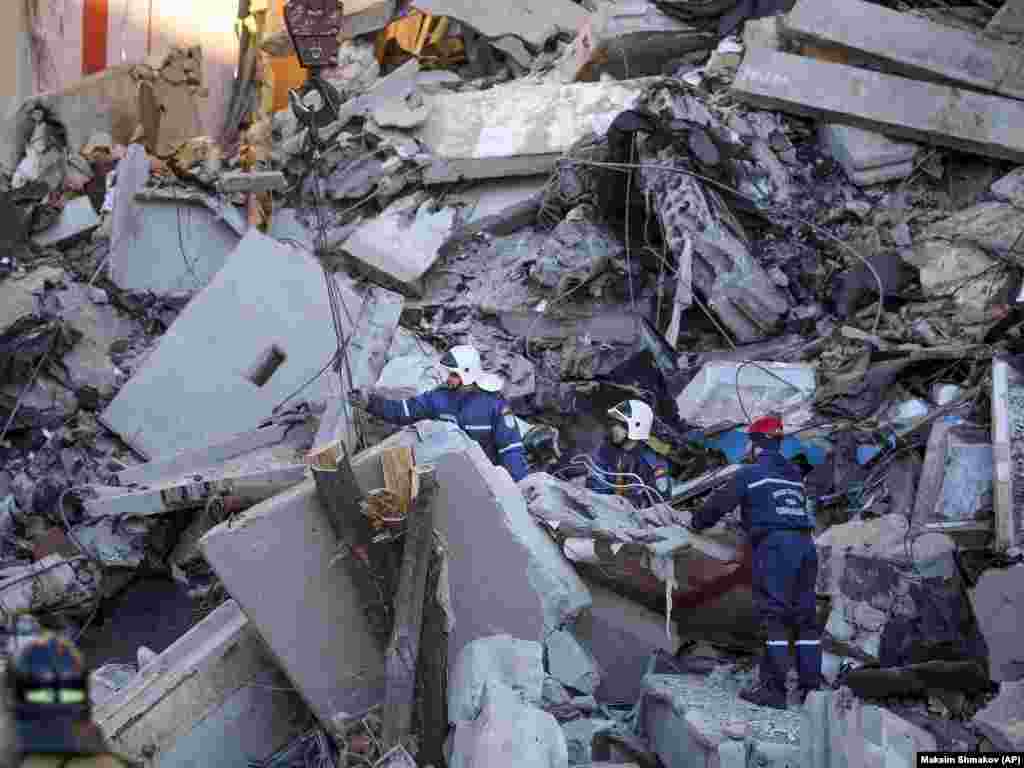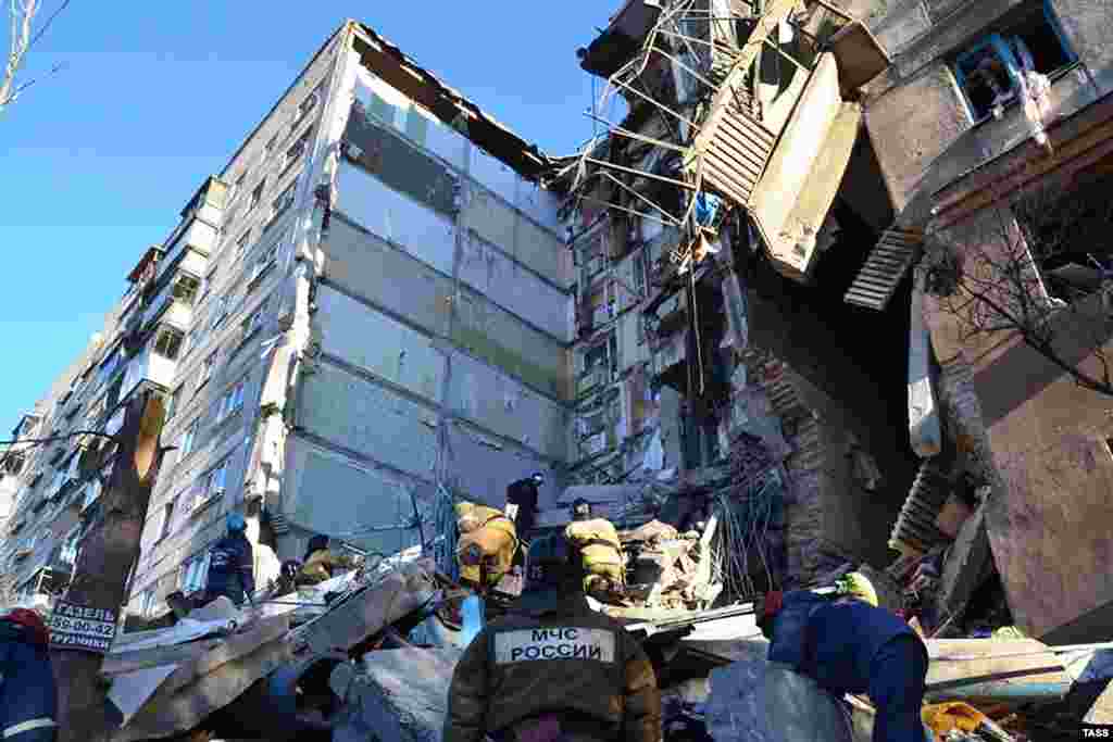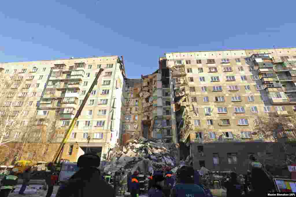 President Vladimir Putin traveled to the city in the southern Urals later on December 31, while rescuers searched through the rubble after almost an entire entryway of the 10-story building came crashing down.