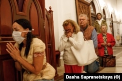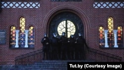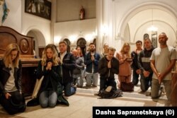 A few meters from the protest, Sapranetskaya noticed several people -- protesters as well as some passersby -- sheltering in an alcove of the Catholic Church of Saints Symon and Alena, a towering redbrick structure in the city center.