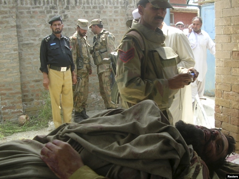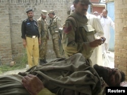 Police and soldiers stand near the body of a suspected suicide bomber, shot dead by security forces in Northwest Frontier Province in April