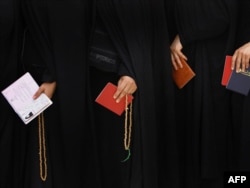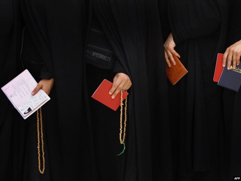 Iranian women hold prayer beads and registration cards as they line up to vote in the holy city of Qom.