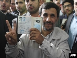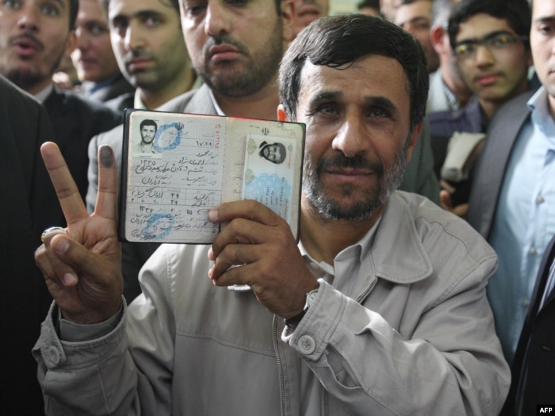 Mahmud Ahmadinejad flashes the victory sign with an ink-stained finger as he holds up his identity cards at a polling station in Tehran.